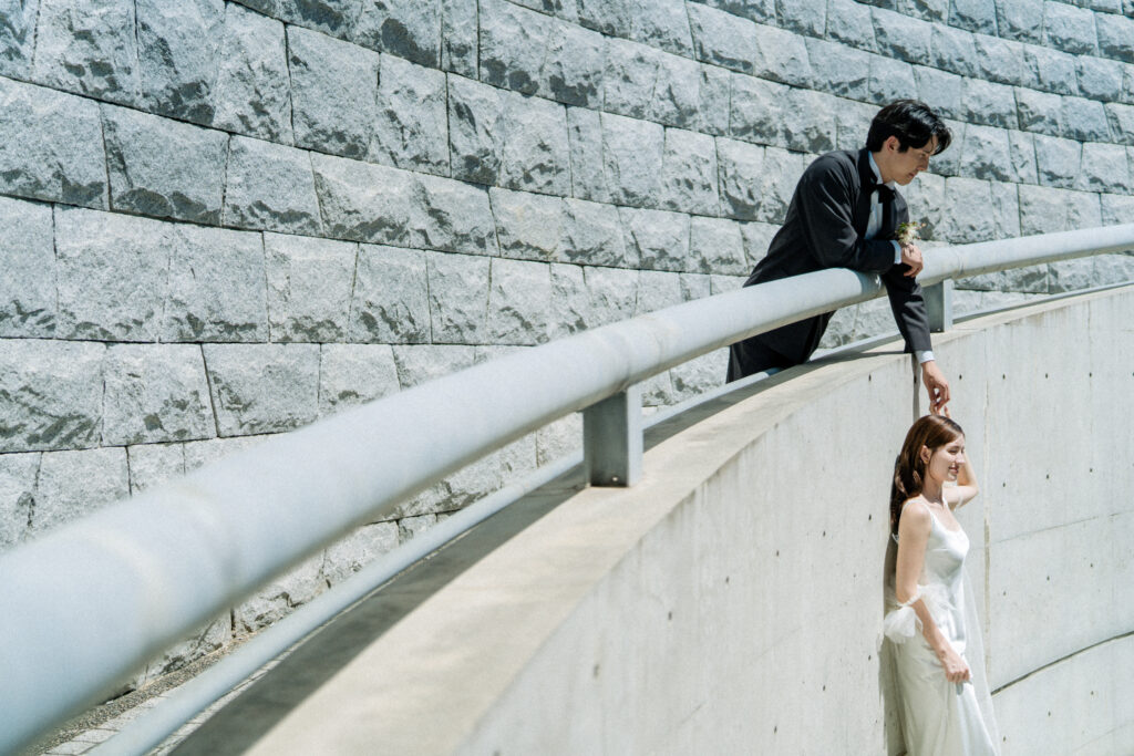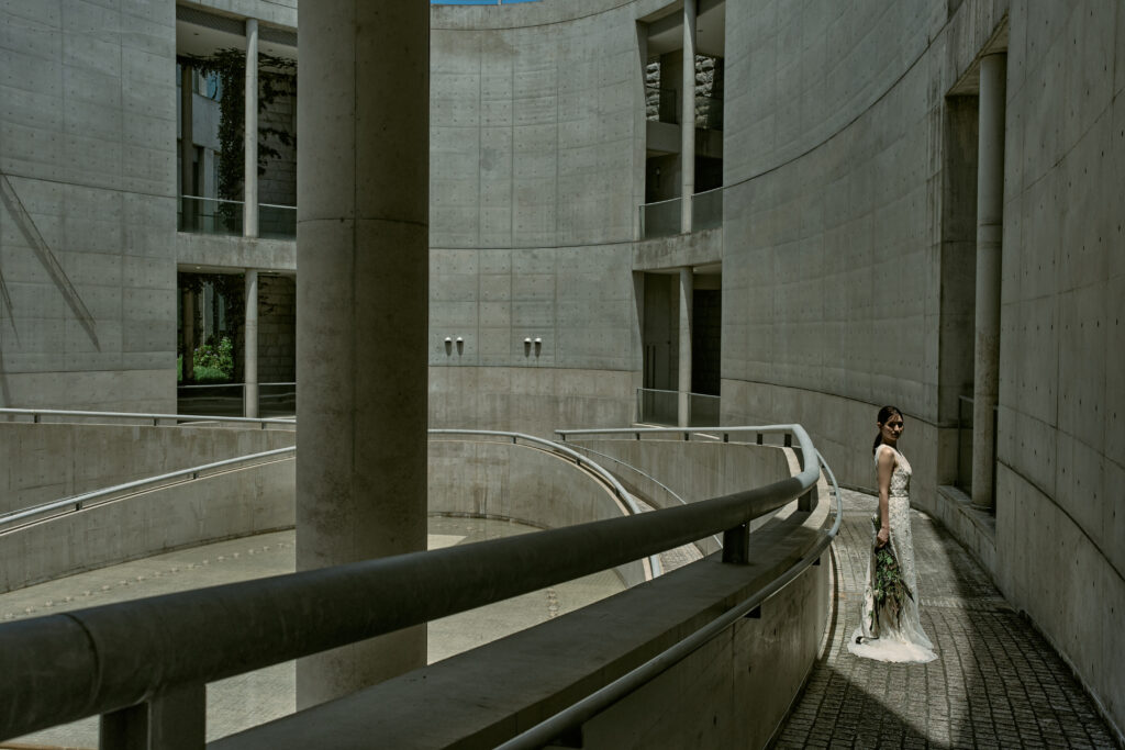 自然光と打ちっぱなしコンクリートの建築がかさなり合い、まるで映画のワンシーンのような一枚に。